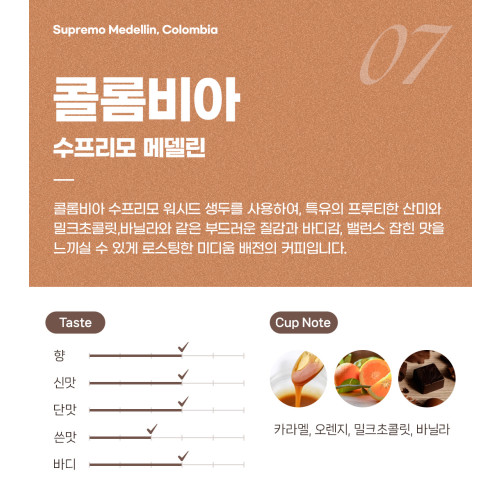 특유의 프루티한 산미와 밀크 초콜릿, 바닐라와 같은 부드러운 질감과 바디감, 굿 밸런스로